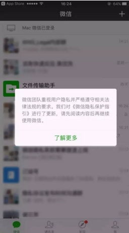 (E安全)9月14日消息,近期,微信进行了版本更新,所有进入iOS 6.5.16 、Android 6.5.14最新版本微信的用户,在首次登入微信时,会收到一条必读消息《微信隐私保护指引》。