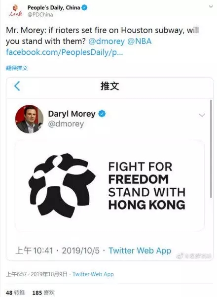 10月5日,莫雷在推特发布支持香港暴乱的言论,