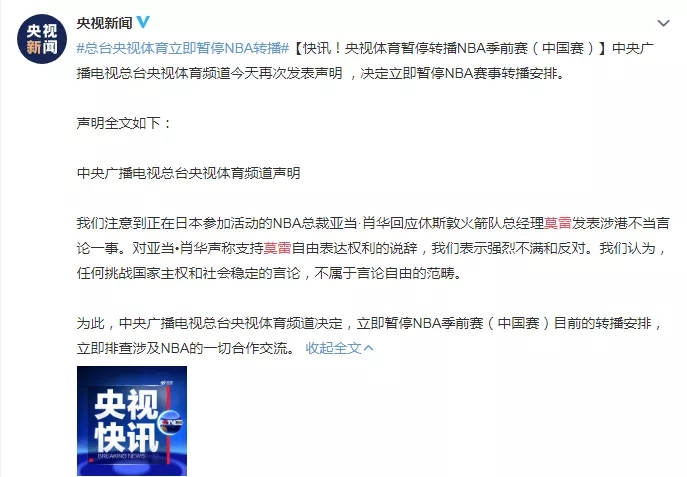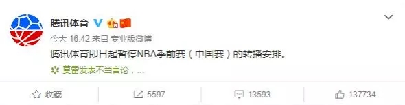央视体育暂停转播NBA季前赛(中国赛),