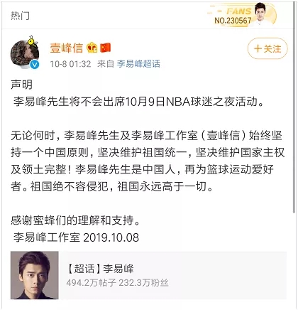 事件发酵后,NBA总裁肖华表示,