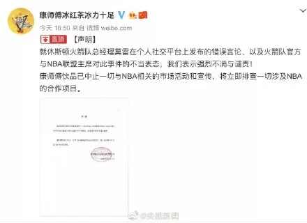官方宣布中止与休斯顿火箭队的合作。