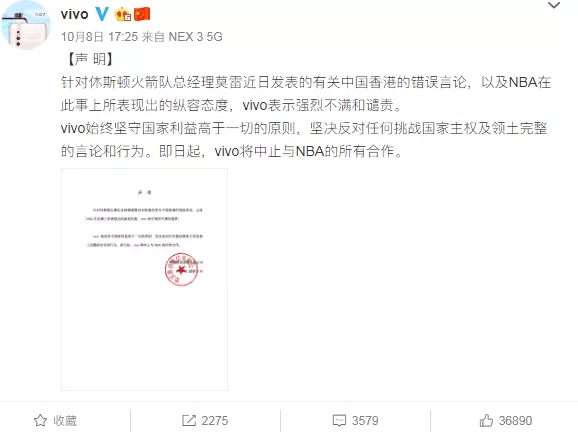 昨天下午17点25分,VIVO宣布中止与NBA的所有合作。