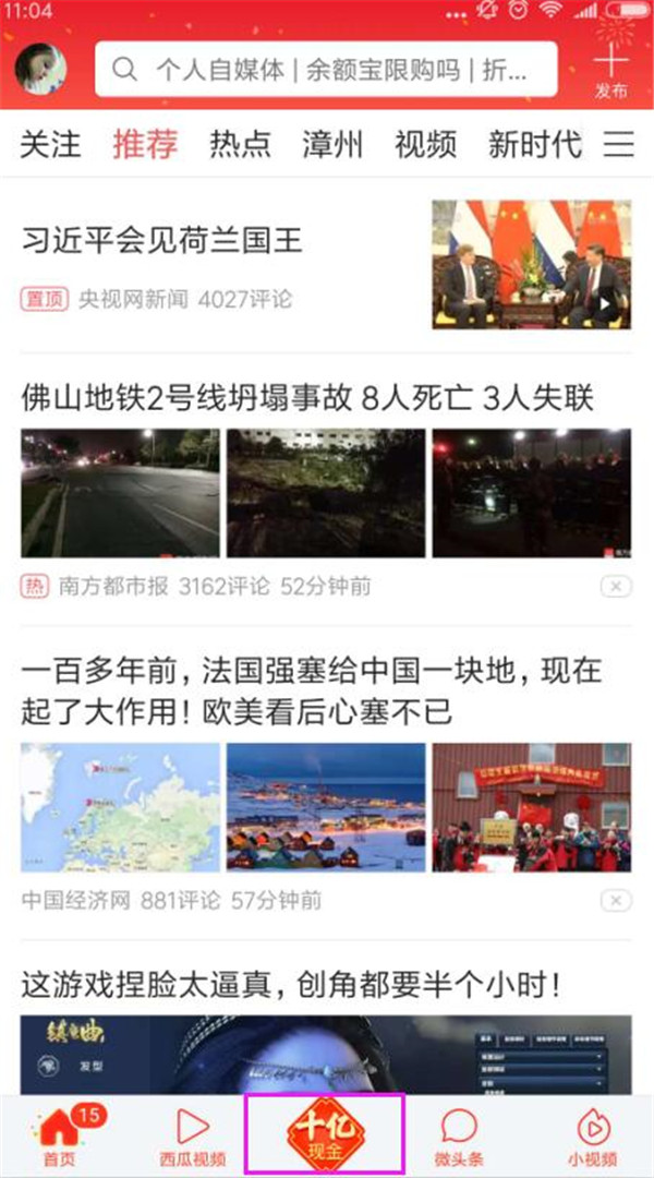 步骤一:进入活动主页打开今日头条,点击最底下——十亿现金。