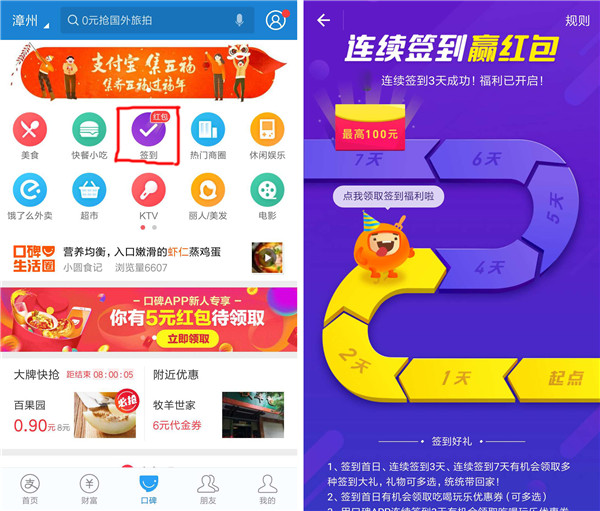 最后:签到领现金红包很多人不知道这里还隐藏了一个红包。支付宝首页——口碑——点击签到,连续签到7天即可获得一个现金红包,最高100元。