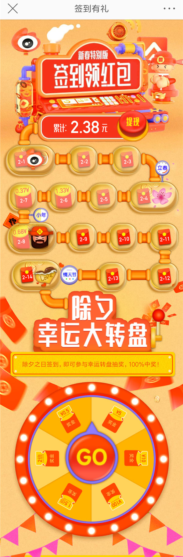 步骤三:签到有礼每天签到,都可以获得红包。除夕那天签到可以抽奖。