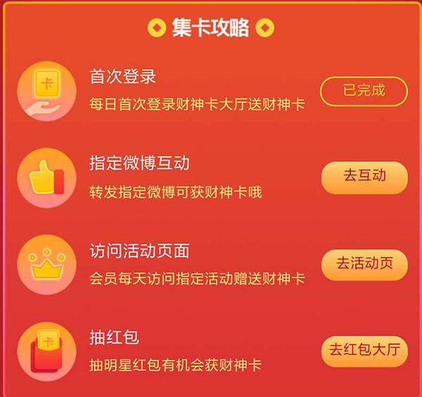 步骤二:集生肖卡除了12生肖卡,还有两张“發”“財”卡,一共14张卡。每天可抽3张。此外,还有其他抢红包活动,请看下图。