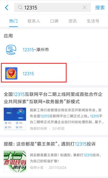 步骤一:打开支付宝,在支付宝在首页或进入“城市服务”搜索“12315”,打开官方12315小程序。