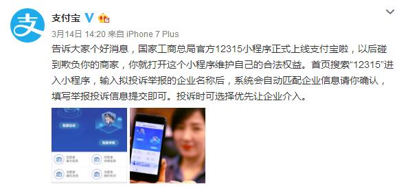昨天,支付宝官微已发布消息,宣布国家工商总局官方12315小程序正式上线,为网民提供便捷的举报投诉通道。