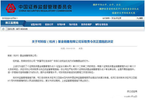 3月20号,中国证监会披露对马云旗下蚂蚁基金财富号红包活动以现金红包形式销售基金行为进行责令整改。原因是不得采取抽奖、回扣或者送实物、保险、基金份额等方式进行基金销售活动。对此,用户真心觉得证监会管的有点多。