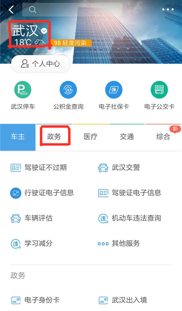 选择好城市后,会自动跳回到城市服务界面,在政务界面找到电子身份卡,如下图所示,点击进入;