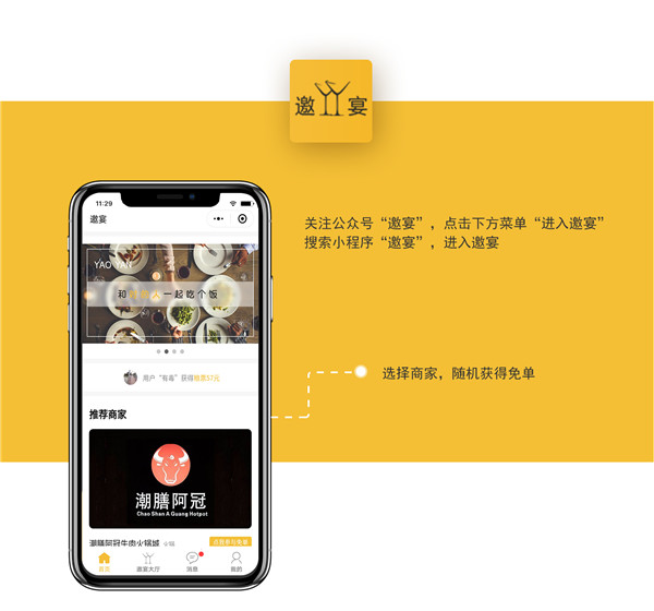 邀宴,是一个为“你想要的聚会”而量身定制的服务平台,基于微信小程序,实现社交+餐饮的模式。