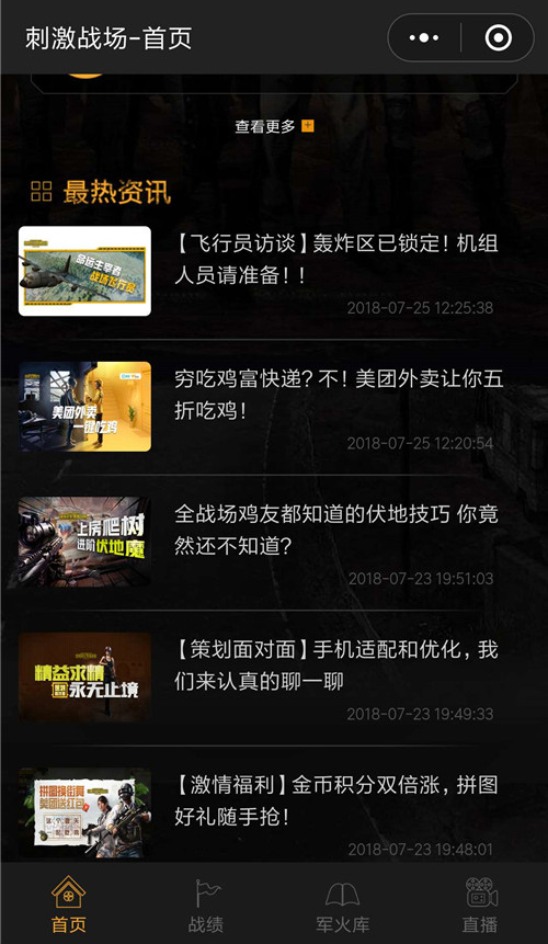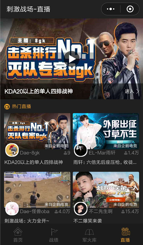 这款小程序主要分为4大模块,首页、战绩、军火库、直播。