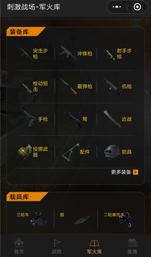 在战场上该捡哪把抢非常非常重要,直接关系到你的生死!现在鸡友们完全不用烦恼了,这里有最详细的装备介绍:从武器到配件到防具和道具,一应俱全!打开【军火库】-【装备库】点击右下角【更多装备】就可查看。