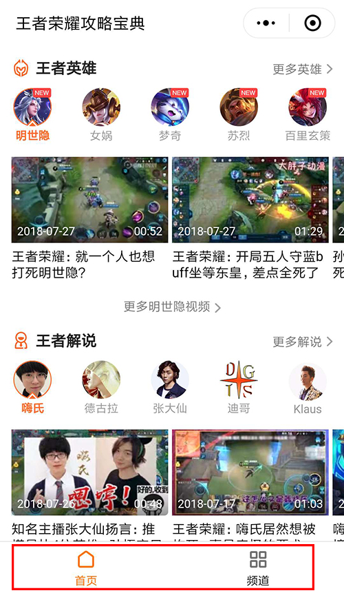 有三个视频栏目分别是王者英雄、王者解说、精选专辑,可以查看各英雄简介及技能,或观看解说视频。