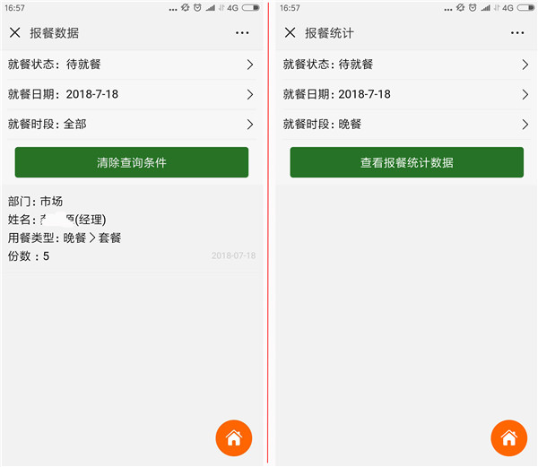 食堂管理者在微信上可实时查看报餐数据,根据用餐人数、份数,按需备餐,既可避免备餐不足,同时也可以减少食材浪费。