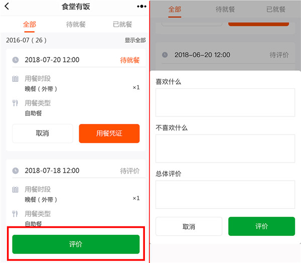用户消费完后,可在消费记录评价用餐体验、菜品,喜欢什么、不喜欢什么等。食堂管理者在后台可查看详细评价信息。
