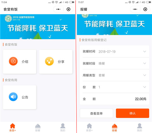 用户可直接在小程序上预先报餐,用餐时段、用餐类型、用餐份数皆可选择,免跑腿;预先支付,免现场支付,简化用餐流程、可提高用餐效率。
