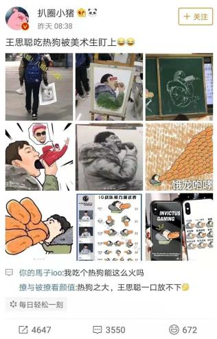 随之而来的,是更大量的网民互动和UGC恶搞。“王思聪吃热狗被美术生盯上”、“IG战队视力测试表”、“王思聪吃热狗手机壳”、“三秒内找到王思聪”、“王思聪吃热狗壁纸”……各种神图如雨后春笋般涌出。