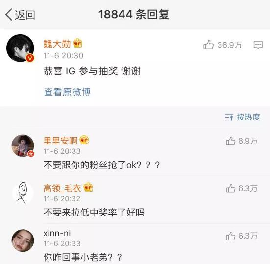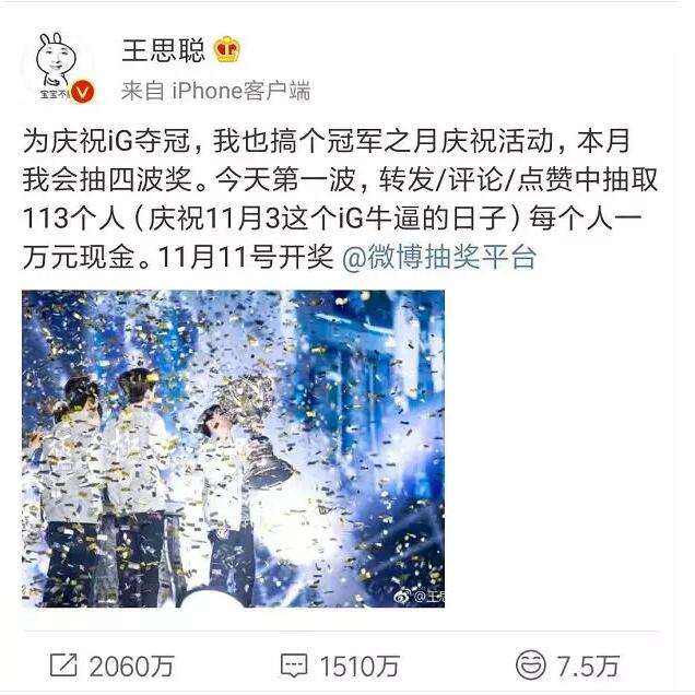 11月6日晚,为庆祝自己一手创建的iG战队夺冠,@王思聪砸钱发起微博抽奖:从转发/评论/点赞中抽取113人,每人1万现金。总计113万。