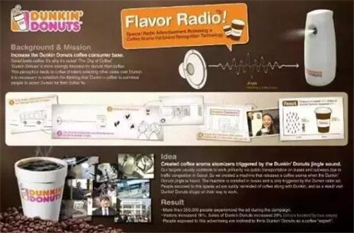 Dunkin Donuts的套路更深,直接把公交车变成了气味营销的阵地。当公交车上播放Dunkin Donuts的咖啡广告时,安装在车顶装置就喷出咖啡香气。在密闭的空间里,一阵阵香气想不注意都难,而一下车又看见了它的站牌广告和不远处的门店......